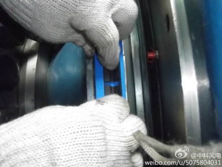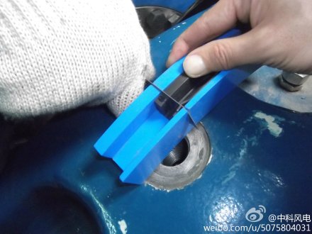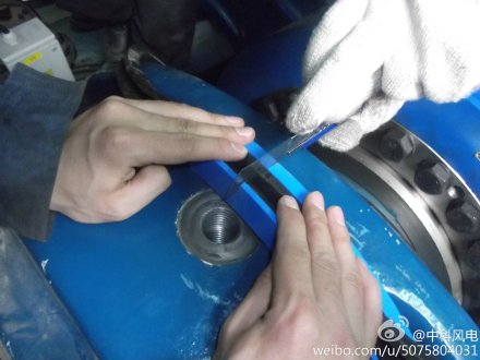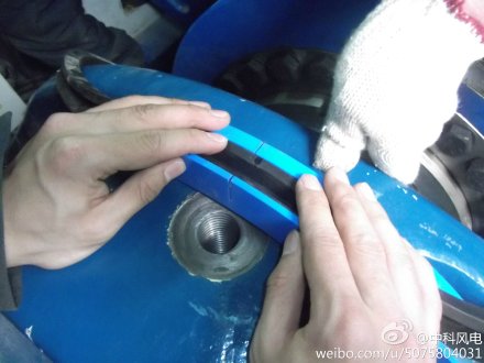 國內雙饋機組雙軸承主軸密封圈漏油、龜裂現(xiàn)場非常嚴重,特別注意的是止推軸承端是高壓電纜通過的地方,所以油脂漏油處理是非常有必要的。照片中,我們服務工程師正在對國內機組主軸雙側龜裂、斷裂的密封圈進行更換,更換后能使漏油現(xiàn)場減少,保證了機組運行安全。